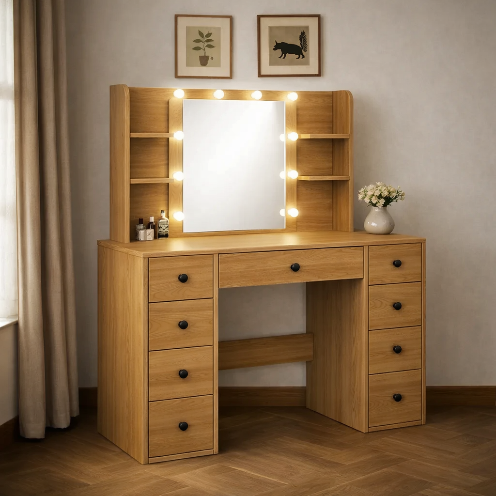 Schminktisch aus Holz mit Spiegel und Beleuchtung mit zehn Schubladen